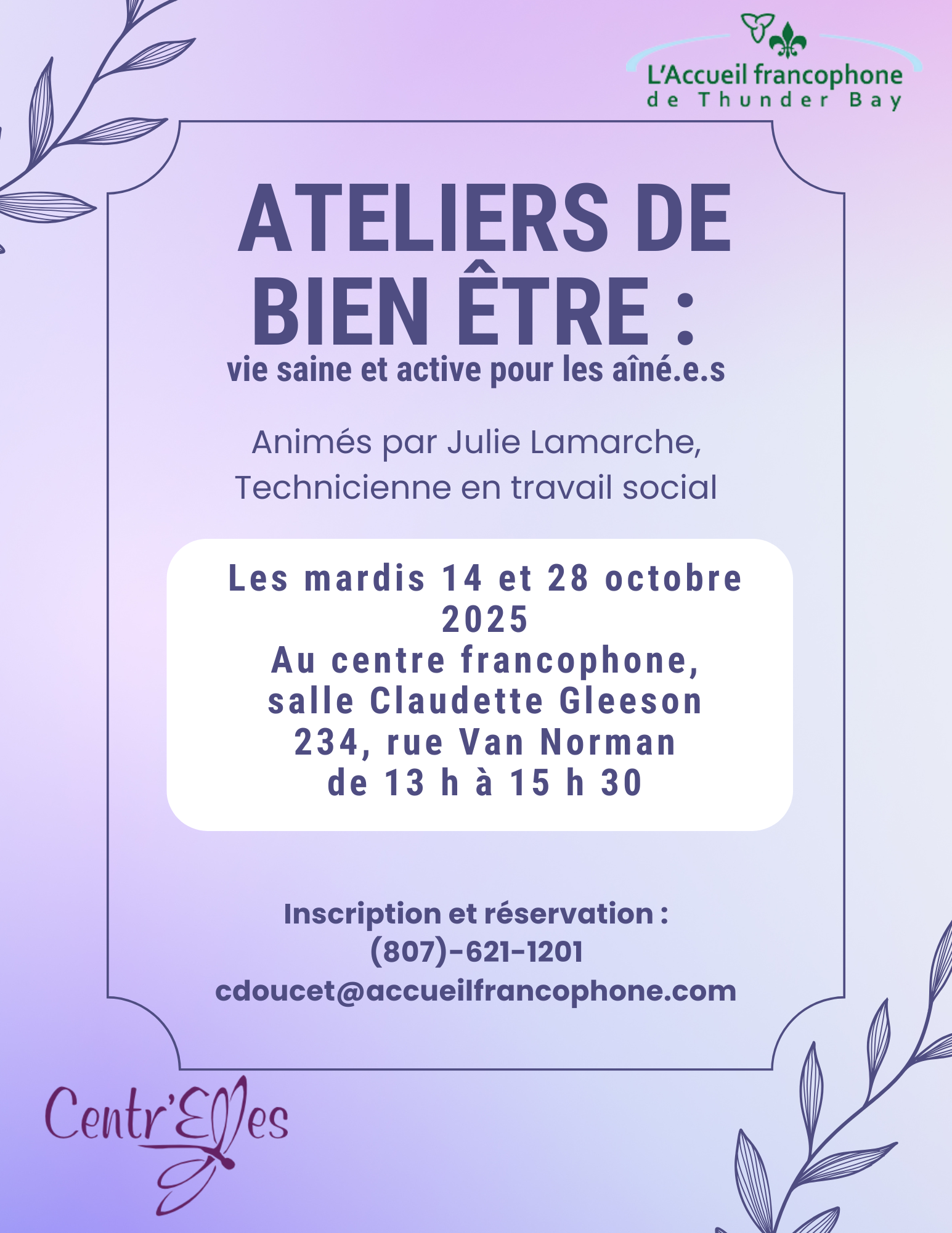 Venez nous rejoindre pour un atelier de bien-être avec Centr'Elles, animé par Julie Lamarche, technicienne en travail social. Pour vous inscrire, veuillez envoyer un courriel à : emilani@accueilfrancophone.com OU appeler le 807 621-1201.