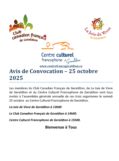 Les membres du Club Canadien Français de Geraldton, de La Joie de Vivre de Geraldton et du Centre Culturel Francophone de Geraldton sont tous invités à l’assemblée générale annuelle de ces trois organismes le samedi