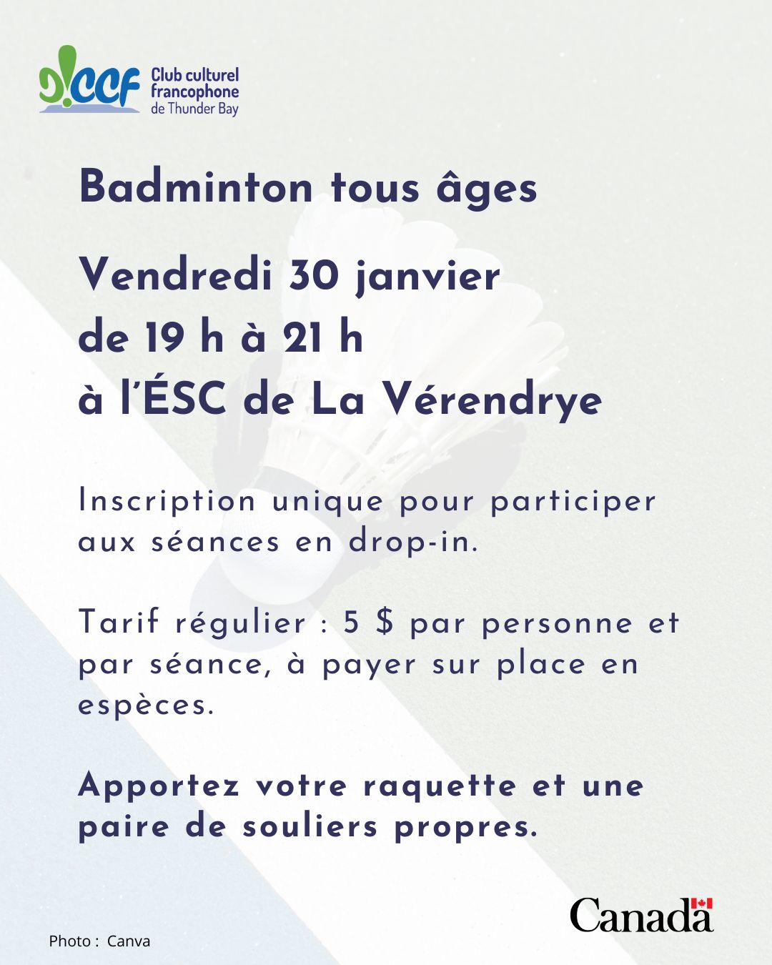 Apportez votre raquette et une paire de souliers propres. Merci de laisser vos souliers d’extérieur en dehors du gymnase.