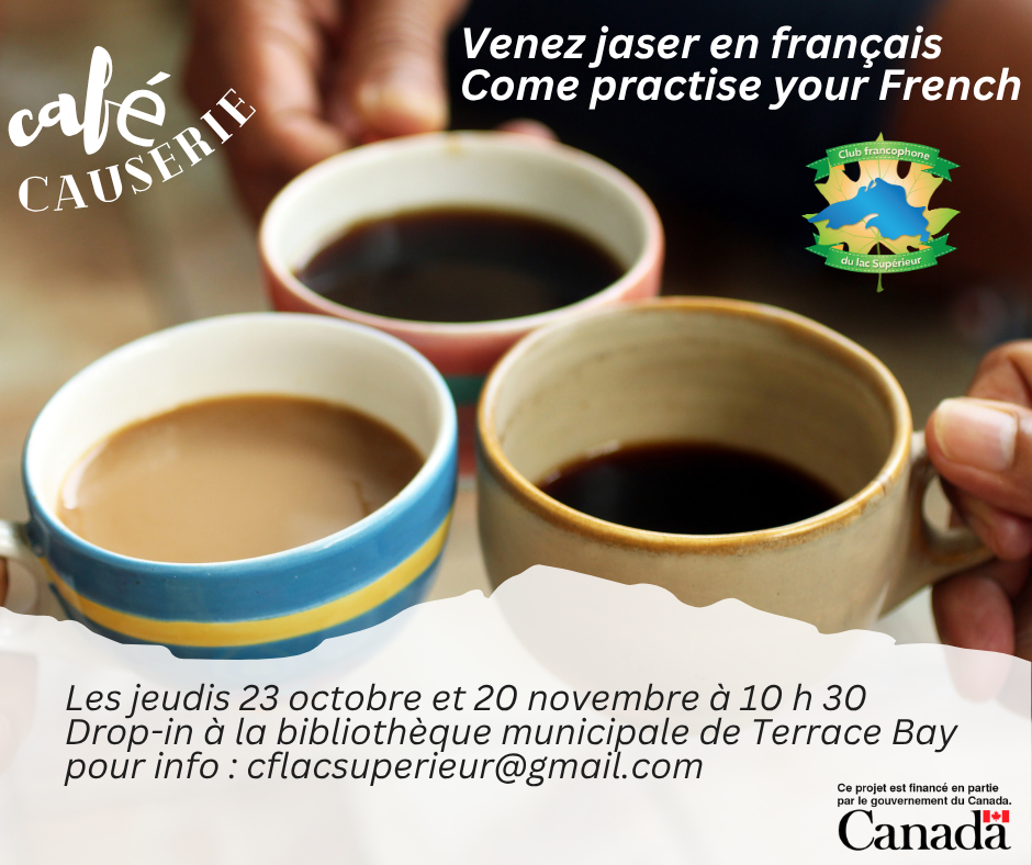 Café-causerie à la bibliothèque de Terrace Bay ☕ Venez prendre un café, une collation et pratiquer votre français dans une ambiance conviviale!