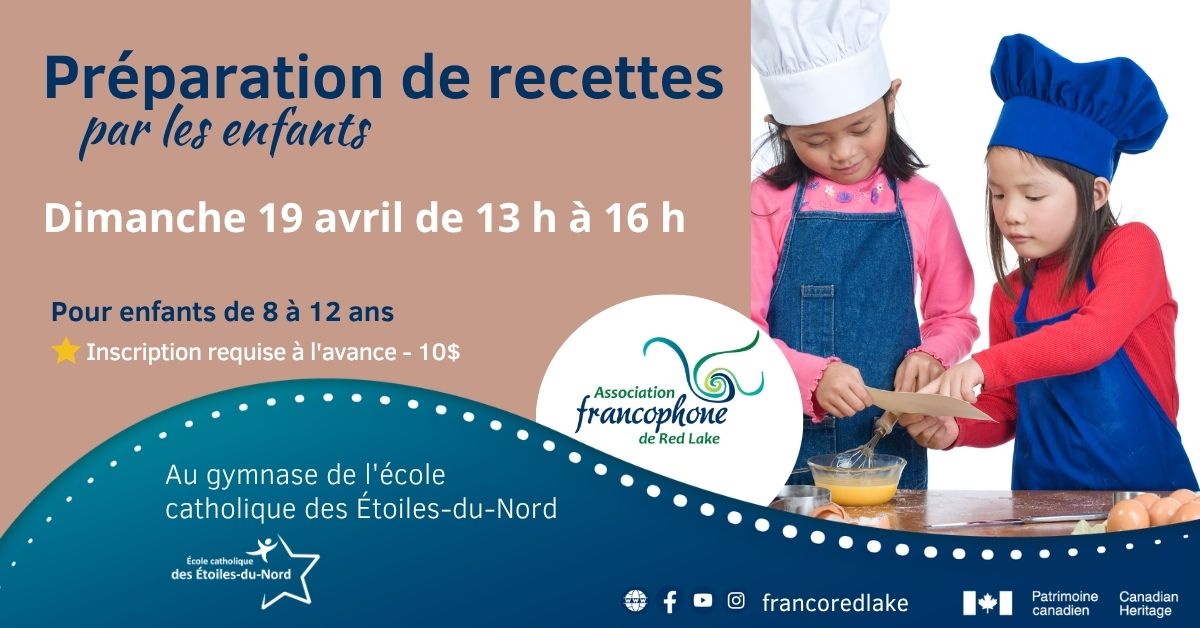Marielle recommence à offrir son activité de cuisine avec les enfants âgés entre 8 et 12 ans. Un maximum de 6 enfants pourra préparer le souper du dimanche pour leur famille, avec de l'aide! La rencontre aura lieu au gymnase de l'école EDN entre 13h et 16h. La cuisson aura lieu dans la cuisine approuvée de l'école.
