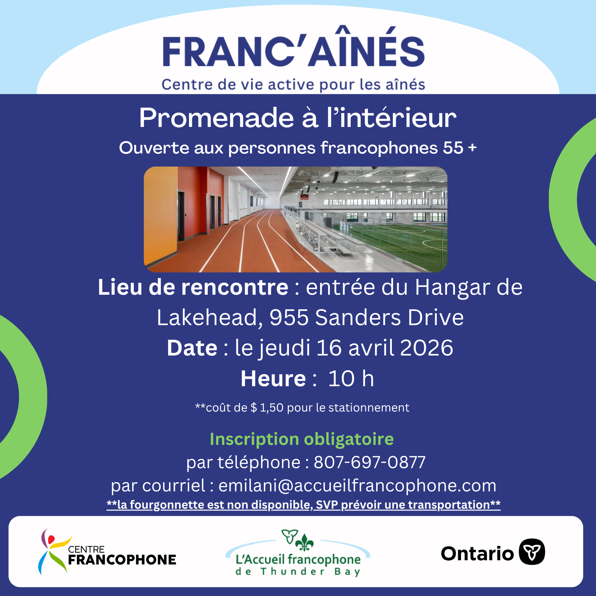 Joignez-vous à notre promenade à l’intérieur au Hangar de Lakehead, animée par notre bénévole Nicole. Une belle occasion de marcher à votre rythme tout en échangeant en français.