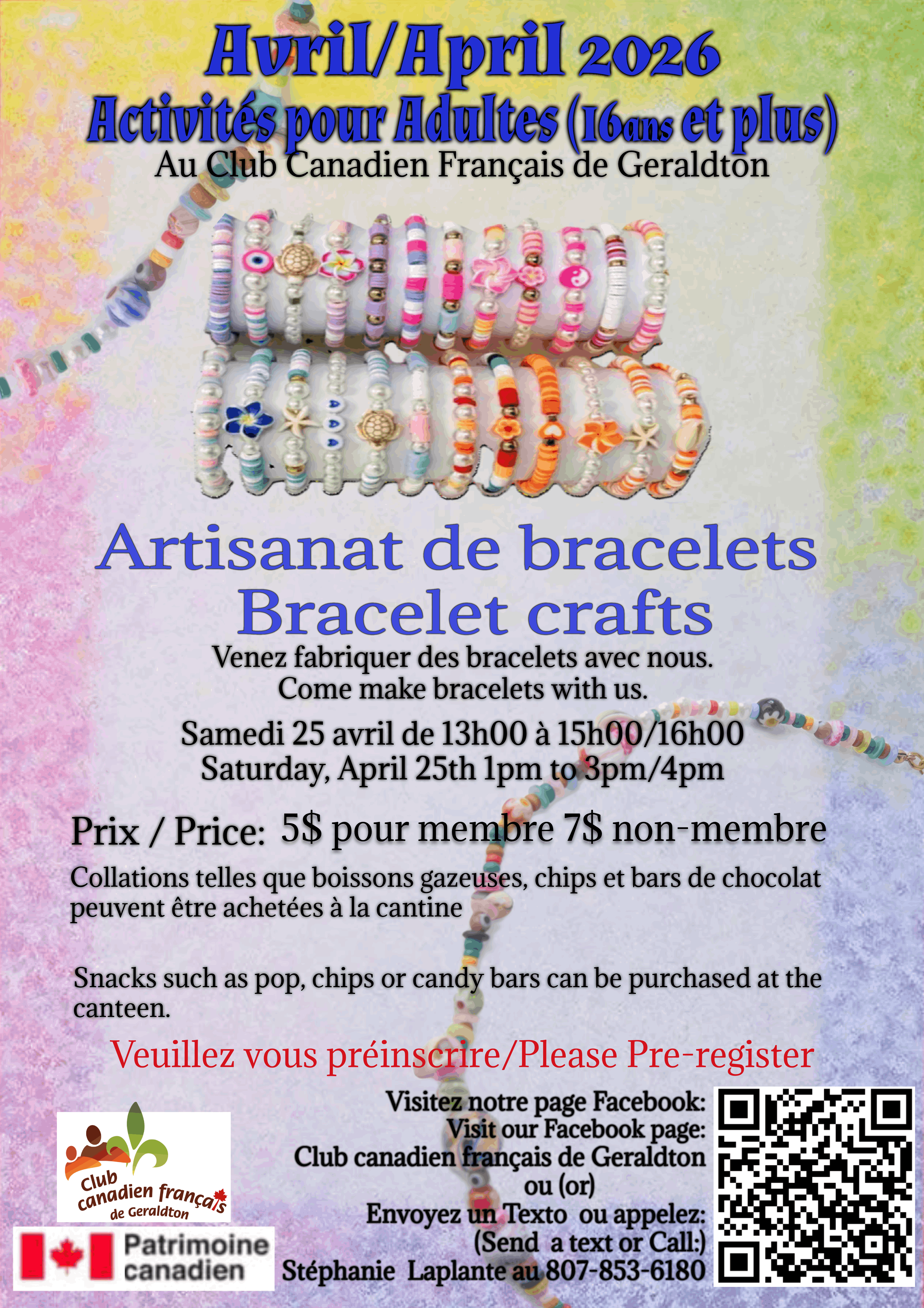 Si vous avez des questions, souhaitez vous inscrire et/ou faire partie de notre chaîne de courriels ou de SMS. Veuillez contacter Stephanie Laplante via Messenger, par texto ou par téléphone. 807-853-6180