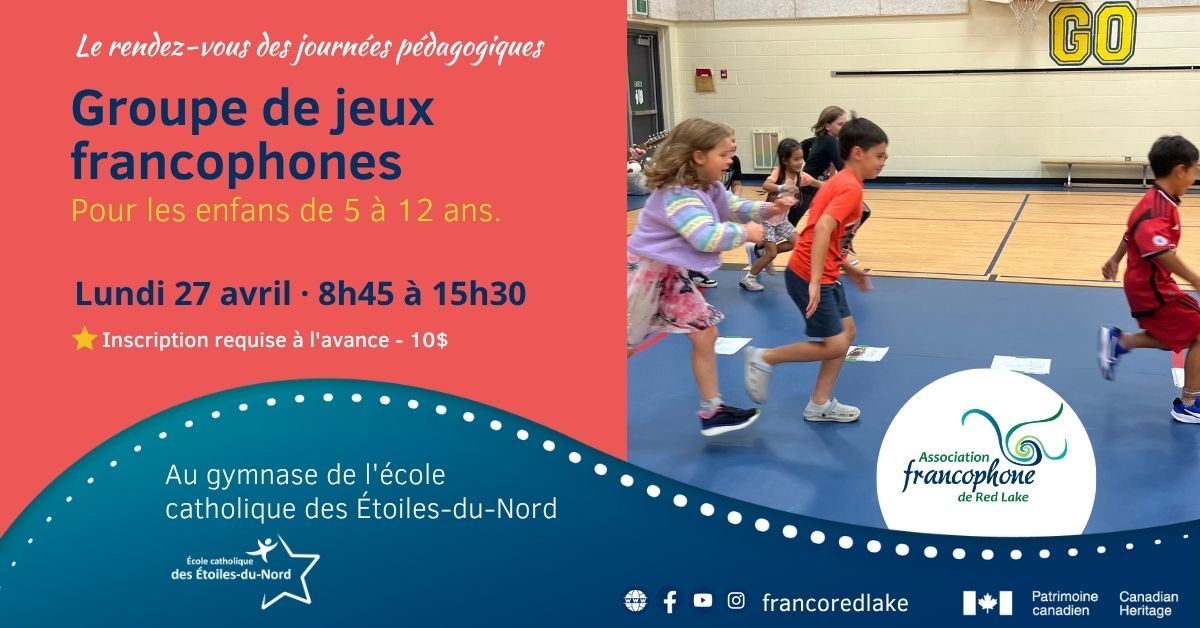 Journée pédagogique scolaire = jeux francophones pour les enfants de 5 à 12 ans, avec notre animatrice Marielle Pellerin, au gymnase de l’école catholique des Étoiles-du-Nord.