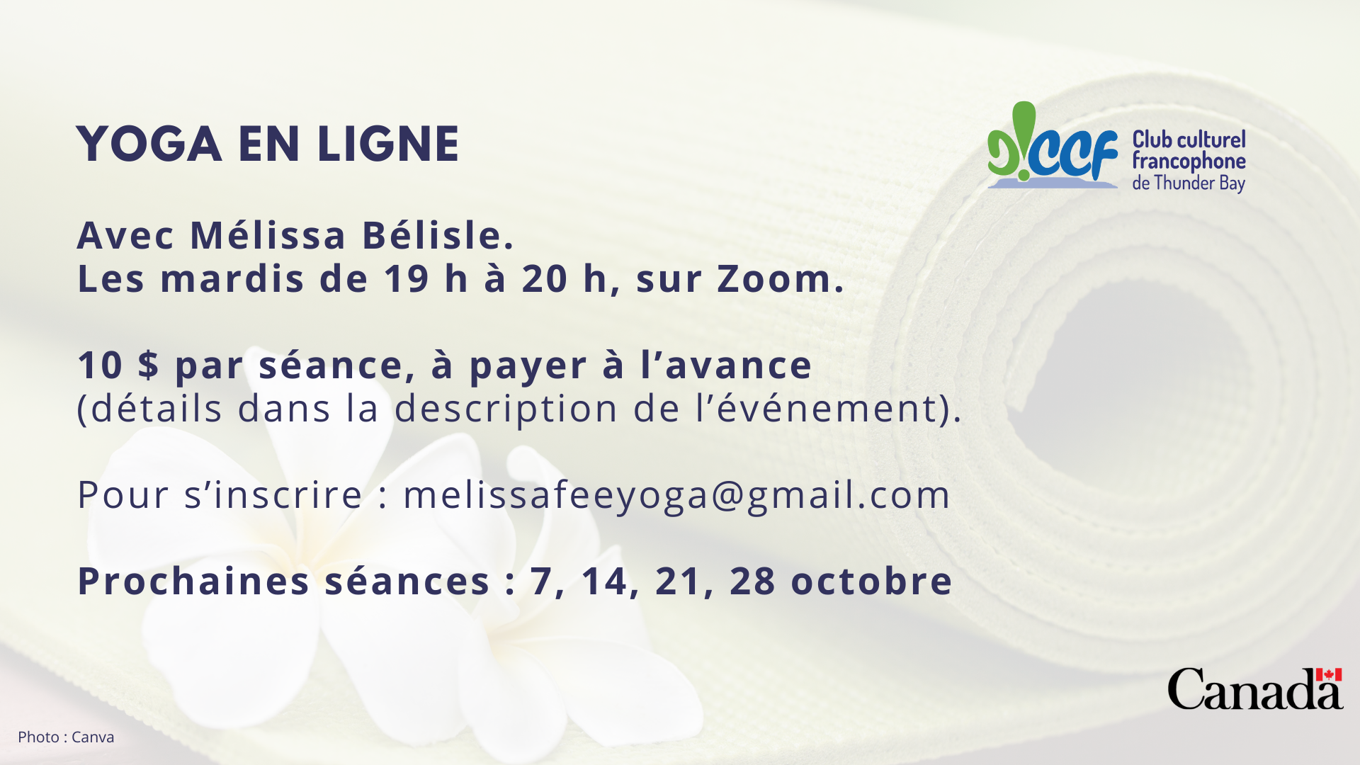 Pour participer, veuillez faire parvenir votre paiement au plus tard 24 heures avant la séance prévue à l’adresse suivante : melissafeeyoga@gmail.com en mentionnant votre nom et courriel.