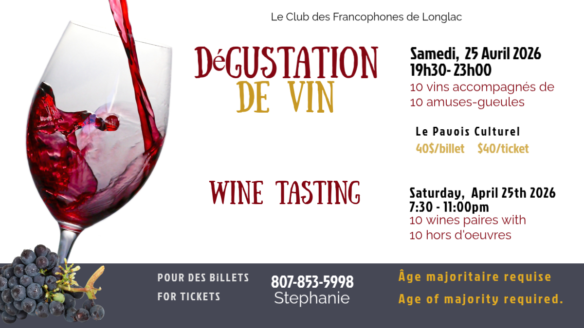 📞 Pour réserver vos places : Appelez Stephanie au 807-853-5998.