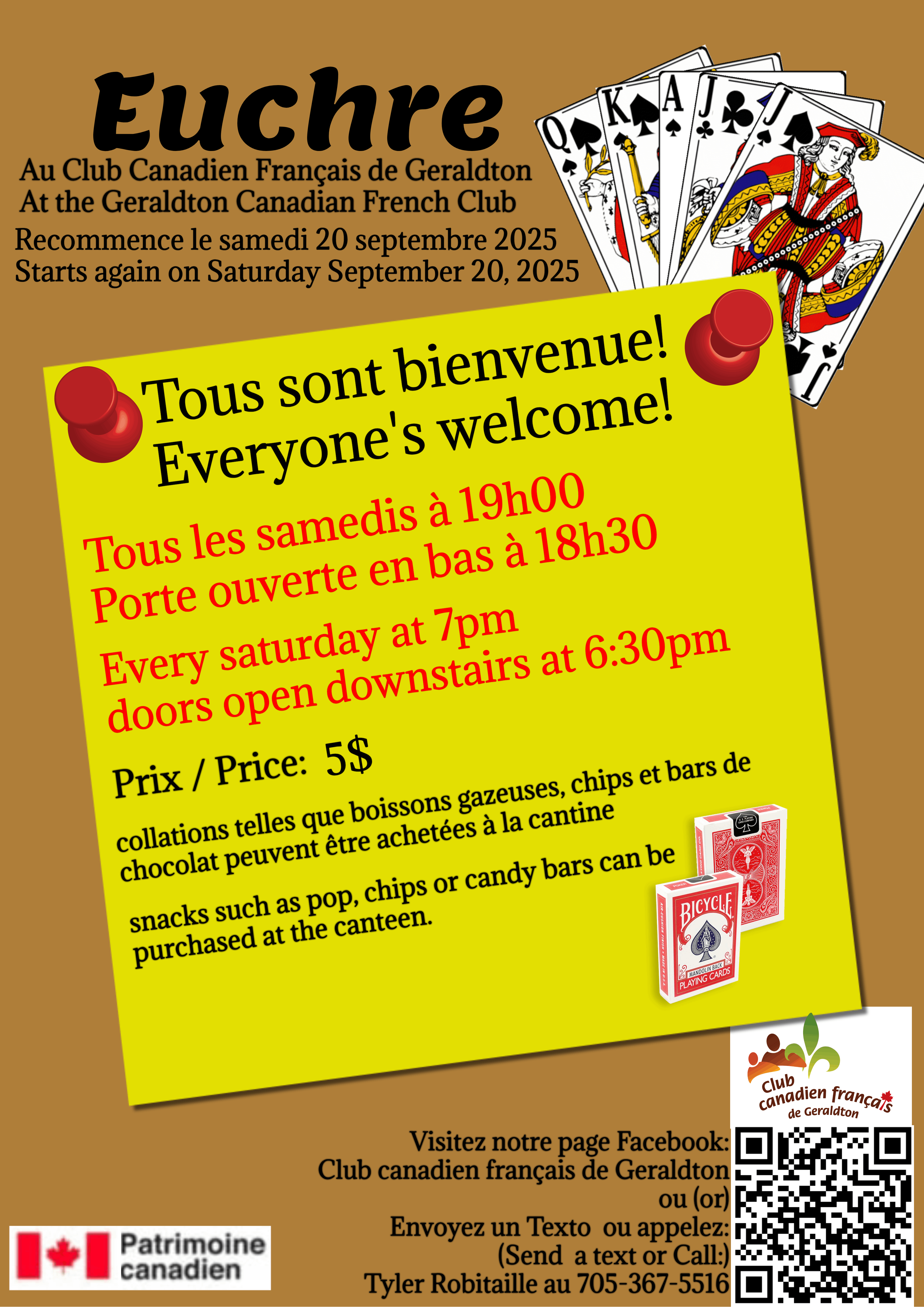 Venez jouer à l'euchre avec nous tous les samedis à 19h00.