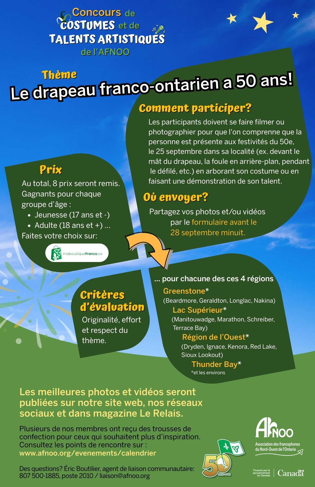 L’AFNOO présente un concours régional de costumes et de talents artistiques (danse, chant, poème, art visuel ou autre) afin que tous puissent présenter et arborer sa création le 25 septembre lors d’une marche, un tintamarre ou un défilé dans sa localité.