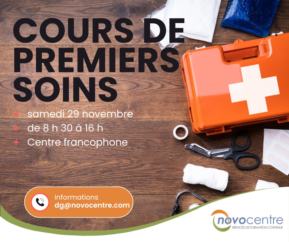 Novocentre est heureux de vous proposer un cours de Premiers Soins en français le samedi 29 novembre de 8 h 30 à 16 h au Centre francophone de Thunder Bay.