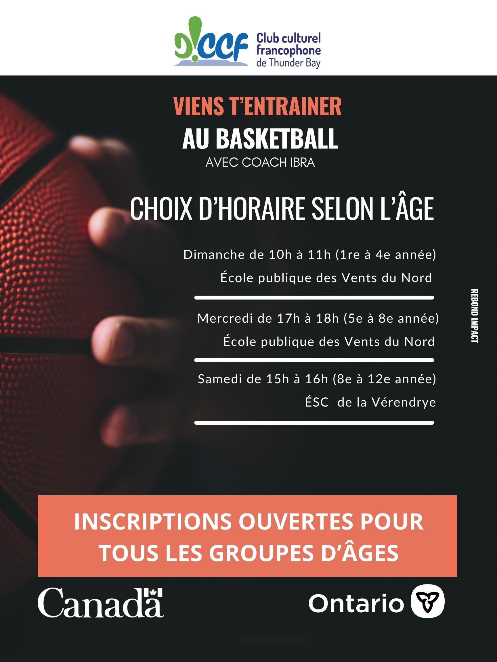 - Mercredis 17 h à 18 h au gymnase de l’École publique des Vents du Nord (5e à 8e année);